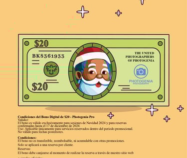 Validez: El bono es válido exclusivamente para sesiones de Navidad 2024 y para reservas confirmadas hasta el 17 de diciembre de 2024. Debes llenar los datos del formulario para que el bono sea aplicable.